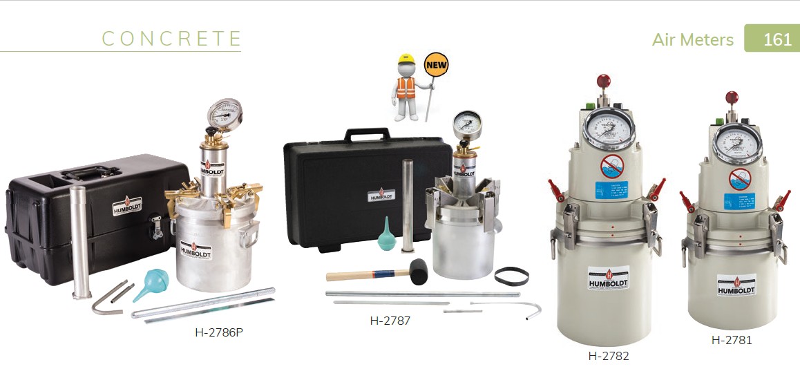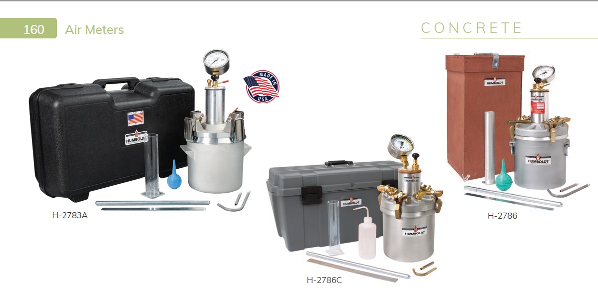 The H-2783A air meter, which exceeds ASTM requirements, features the Humboldt, all-brass super pump, the most reliable and highest qual- ity pump available. The meter’s easy-to-use, and extra durable stainless steel clamping system employs four, one-piece, self-locking clamps that quickly seal the lid to the base with proper tension aided by an o-ring to assure a watertight seal. The large, easy-to-read, 4-inch diameter, heavy- duty, direct percentage gauge with calibration adjustments is accurate to the nearest 0.1%. The bucket, or pressure chamber, features EZ-grip, cast handles, which improve usability. This is especially true when the bucket is also used as a 0.25 cu. ft. unit weight measure. The lid of the pressure meter features a smooth sloped top so water and concrete wipe right off. By eliminating the cavities in the lid that trap and hold concrete, maintenance and repair problems are greatly reduced. The meter also features a machined base, which ensures the meter sets level when conducting tests. The kit includes a durable plastic carrying case; a tamping rod; strike-off bar; rubber bulb syringe; plastic calibration vessel; inside cali- bration tube, outside calibration tube and operat- ing instructions.