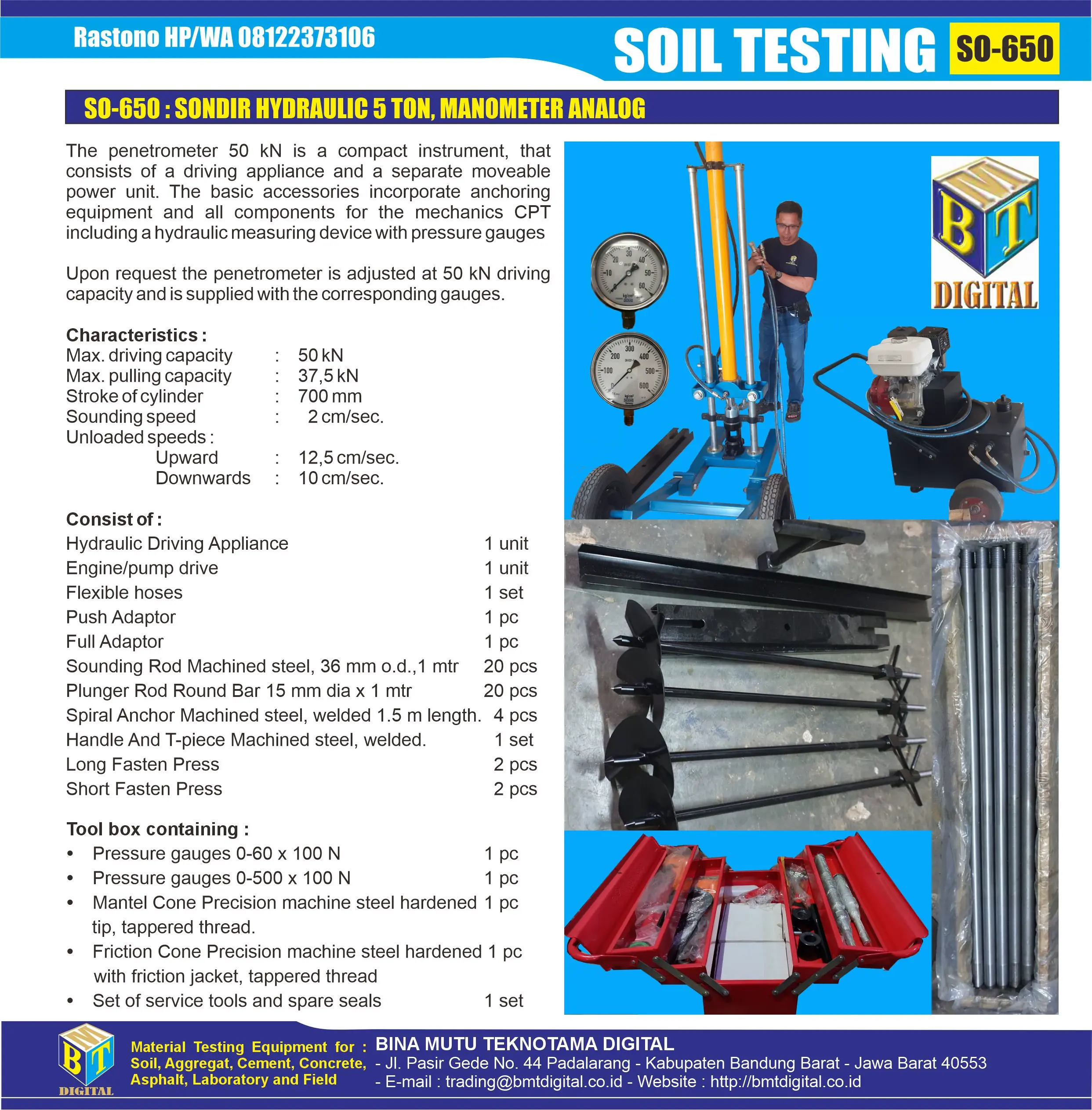 SO-625 Sondir Hydraulic Ringan 2.5 Ton dan SO-650 Sondir Hydraulic Berat 5 Ton meskipun sudah menggunakan penggerak hydraulic, namun maksimum kedalaman tanah yang bisa dijangkau adalah 20 meter, dimana setiap interval 20 cm dilakukan pembacaan perlawanan konus dan perlawanan geser. Adapun rincian lengkapnya dapat dilihat pada gambar di bawah ini.