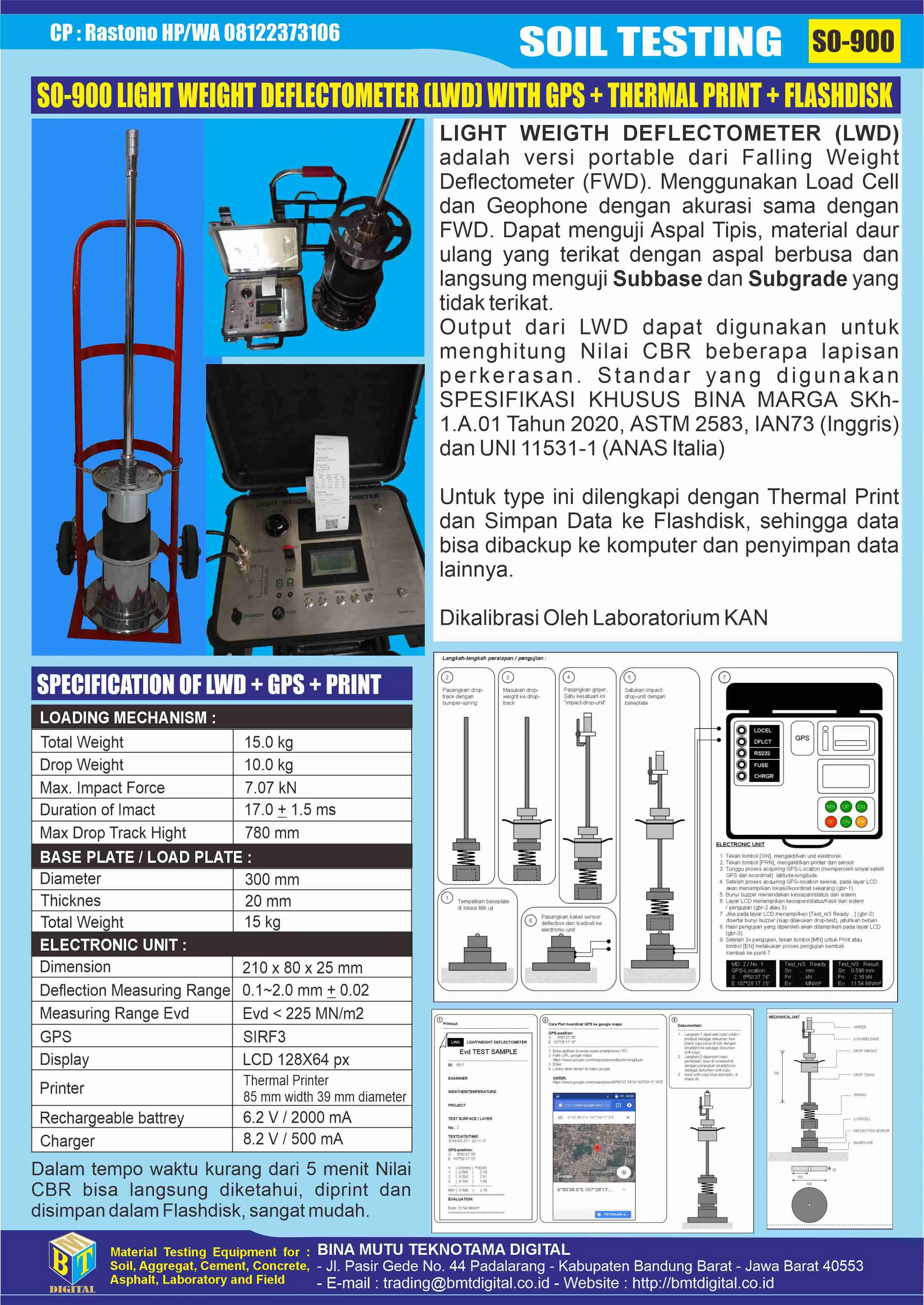 - SO-900 LWD WITH GPS, THERMAL PRINT, USB PORT (PRODUK BMT DIGITAL) : LWD Versi ini Dikalibrasi Laboratorium KAN (Non Validasi Pusjatan), sangat mudah digunakan, sudah dilengkapi dengan Thermal Print sehingga data langsung didapatkan dan tidak bisa direkayasa, untuk keperluan Back Up data bisa disimpan pada USB. LWD ini juga dilengkapi dengan GPS sehingga lokasi data diketahui langsung dan tidak bisa dipindahkan ke lokasi lain.