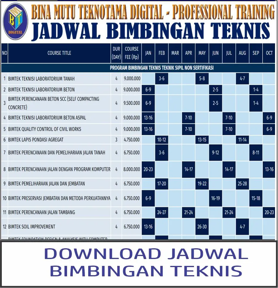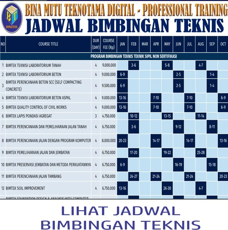 Bimbingan Teknis (BIMTEK) ditujukan untuk Instansi Dinas Pekerjaan Umum dan Penataan Ruang (PUPR), Bidang Bina Program dan Pengujian, UPTD Pengujian Provinsi, Kabupaten maupun Kota. Jadwal pelatihan yang kami susun disesuaikan dengan kebutuhan masing-masing, dan apabila Program yang dibutuhkan tidak tercantum dalam Jadwal Bimbingan Teknis maka silahkan untuk mengajukan permintaan khusus, dengan senang hati akan kami buatkan program BIMTEK tersebut. Untuk menunjang keberhasilan tersebut, Bina Mutu Teknotama Digital menyelenggarakan Bimbingan Teknis baik berupa Pelatihan Reguler maupun In-House Training diantaranya :