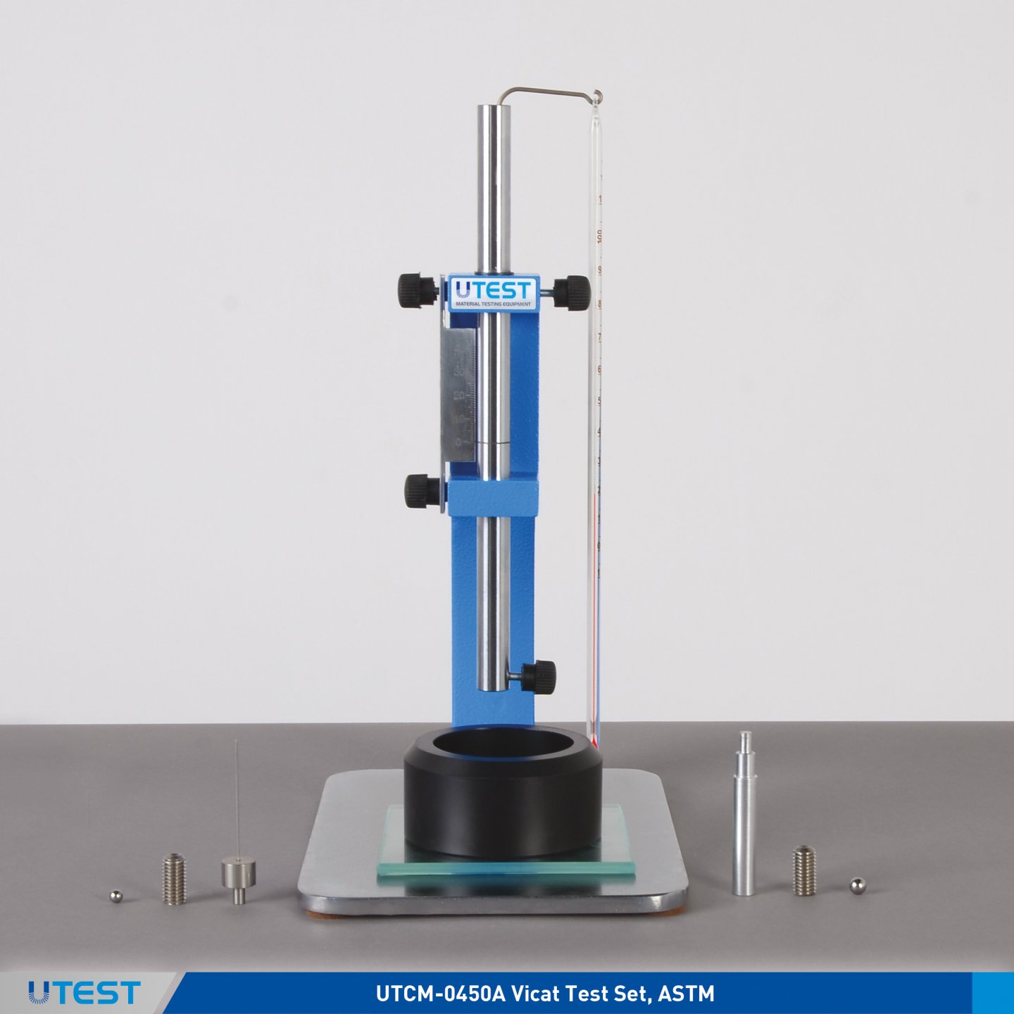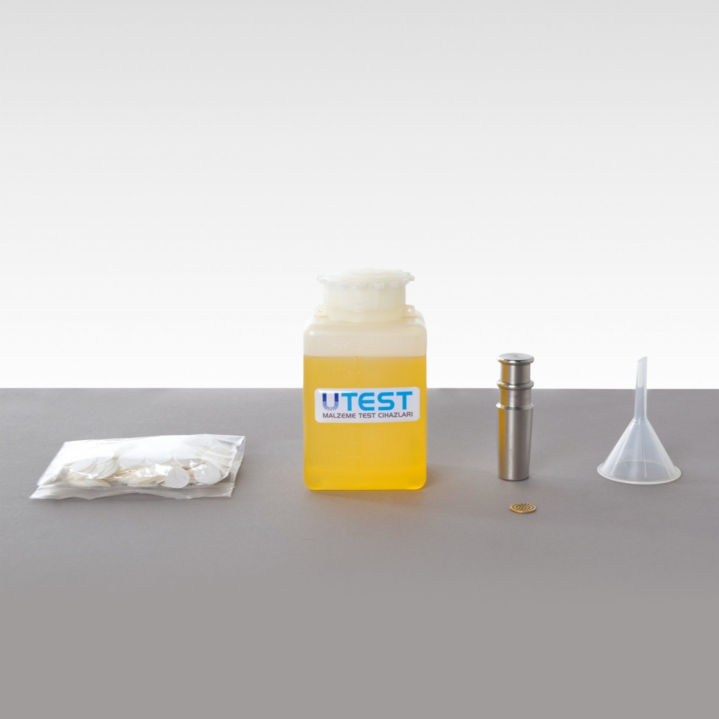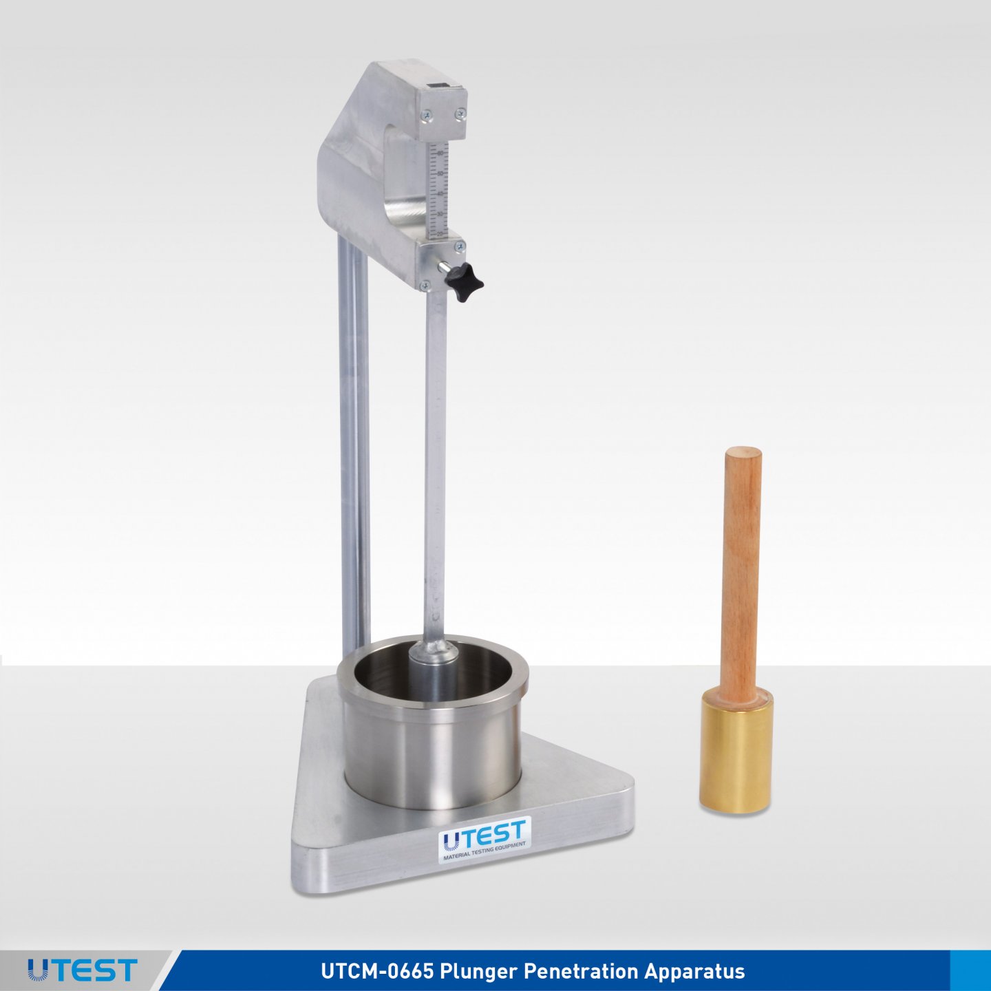 To avoid the operator’s hands coming into contact with the test material, a handle is provided. Supplied complete with 1 liter capacity plastic measuring cup.