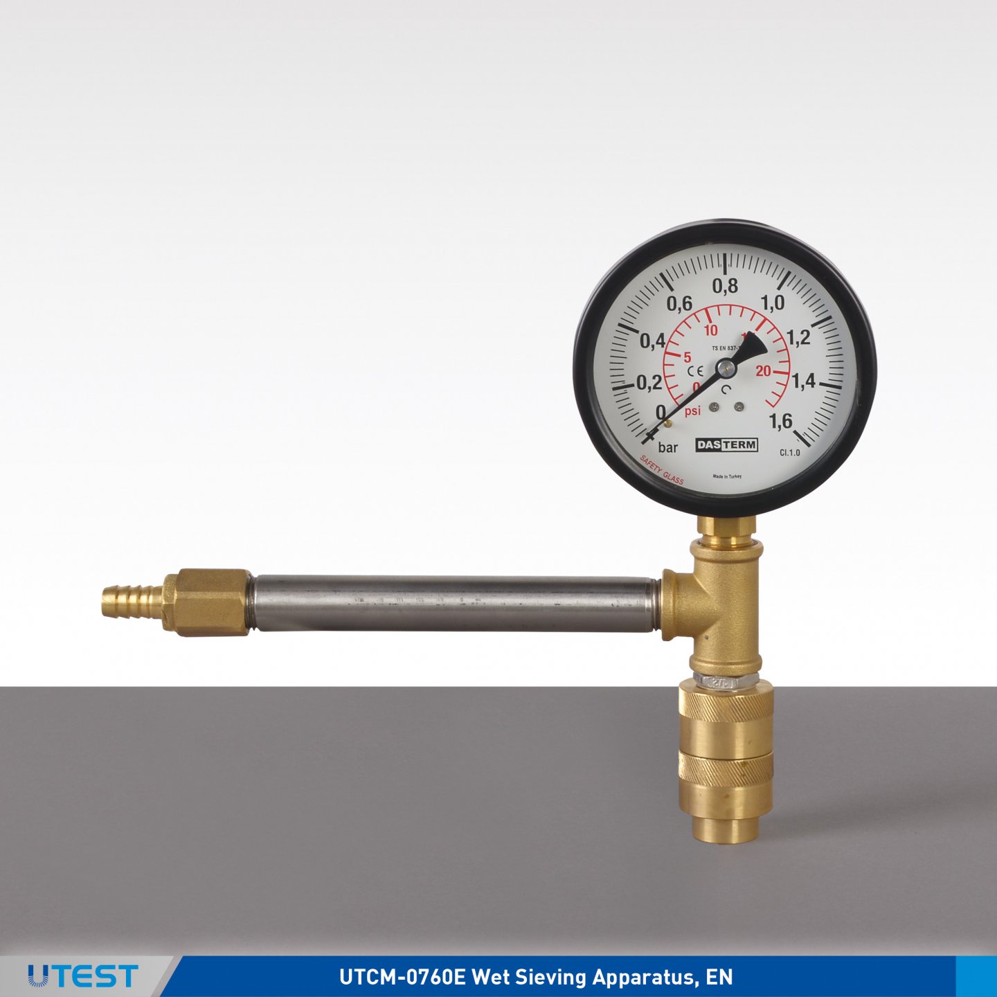 The UTCM-0760E Wet Sieving Apparatus is used for determining the fineness of fly ash. The apparatus comprises of a special stainless steel sieve, 0.045 mm opening, a spray nozzle Ø 17.5 mm with 17 holes Ø 0.5 mm oriented and spaced to conform to the standards. Supplied complete with a pressure gauge Ø 80 mm and fittings for connection to the water supply.